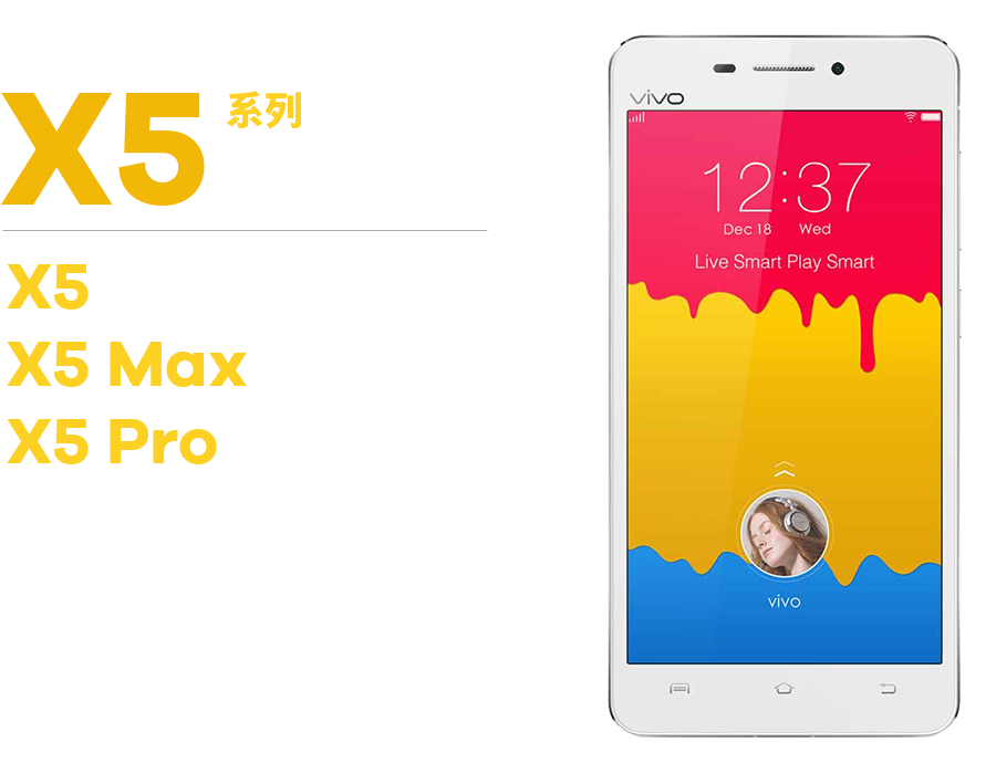 XShot 的同年,vivo X 系列更新到了第三代 —— X5 系列。X5 系列有三个版本 —— 标准版的 X5 、X5 Pro 和 X5 Max,其中 X5 和 X5 Max 用的是塑料、金属、塑料三段式背部设计,而 X5 Pro 是整个 X 系列首款采用玻璃背盖的机型。整个系列依然主打音乐,同时还为手机 K 歌优化,加入了雅马哈 YSS205X 芯片,并内置了 KTV 点歌系统。