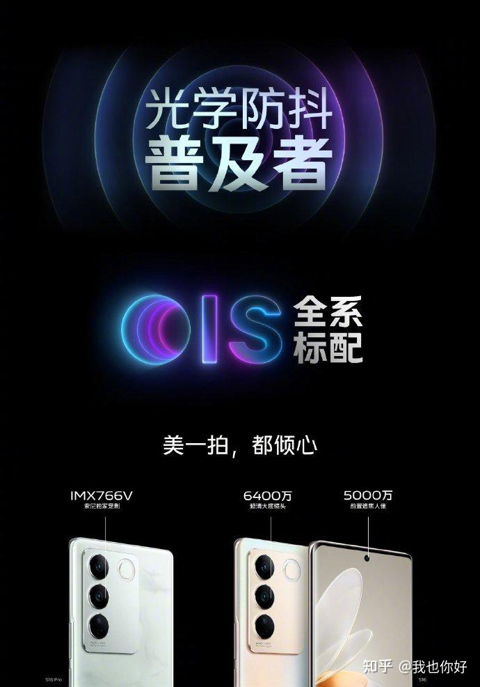 vivo S16 Pro 搭载前置50MP居中挖孔镜头,后置50MP OIS主摄(索尼定制IMX766V)+ 8MP超广角+2MP微距三摄,镜头旁有一个环形柔光灯。