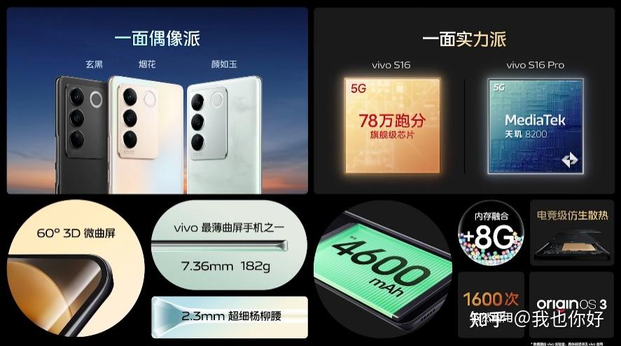 vivo S16系列拥有三款配色,厚7.36mm,重182g,主打“颜如玉”配色。