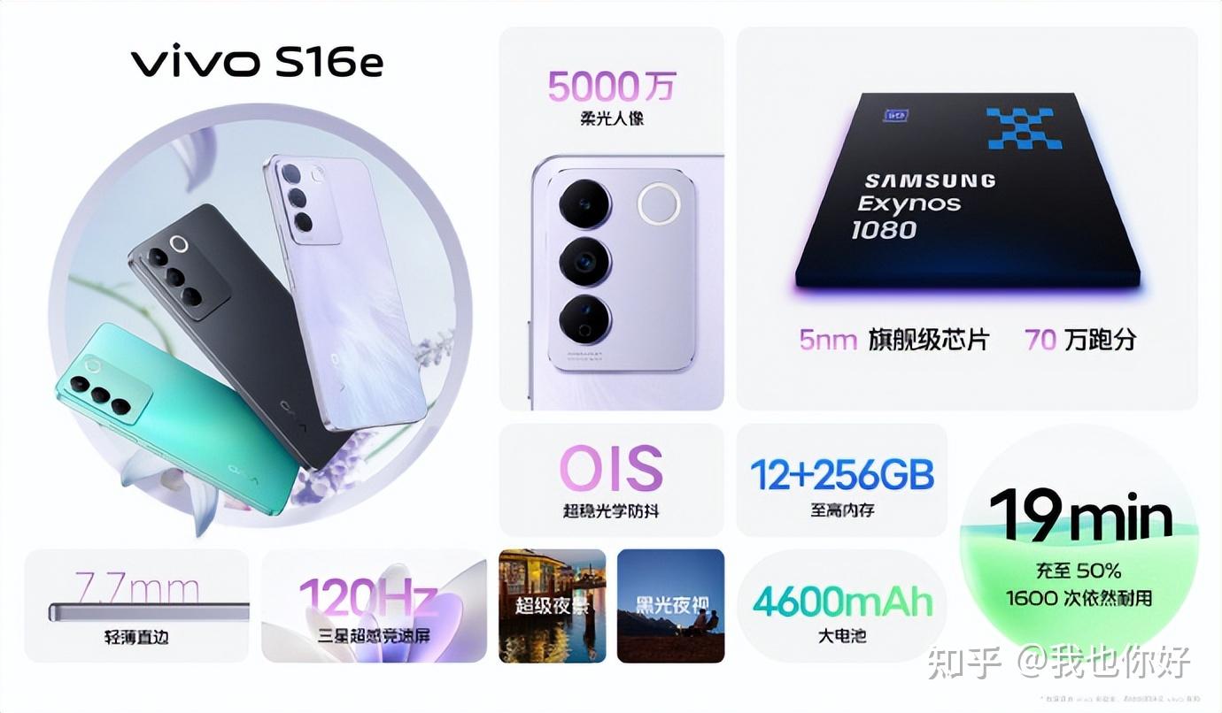 vivo推出了一款vivo S16e,搭载三星 Exynos 1080处理器,采用直角边框和6.78英寸2400×1080三星 E4 OLED直屏,支持120Hz刷新率,同样有OIS光学防抖,售价2099元起。